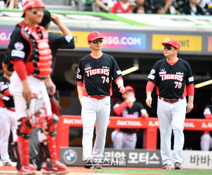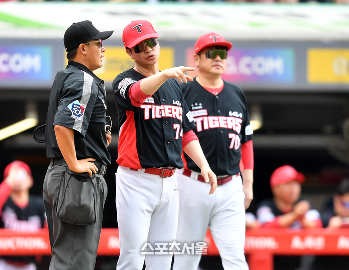 KIA 김종국 감독이 3일 인천SSG랜더스필드에서 열린 2023 프로야구 SSG랜더스와 KIA타이거즈의 경기 1회말 최정의 타구가 인정2루타 아니냐며 구심에 어필하자 심판들이 모여 의논하고 있다. 최정의 타구는 인전2루타로 인정되어 3루에서 2루로 돌아갔다. 2023.09.03.