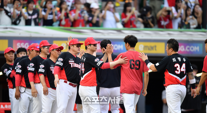 KIA 김종국 감독이 3일 인천SSG랜더스필드에서 열린 2023 프로야구 SSG랜더스와 KIA타이거즈의 경기 9회말 수비를 마친후 선수들과 자축하고 있다. 2023.09.03.