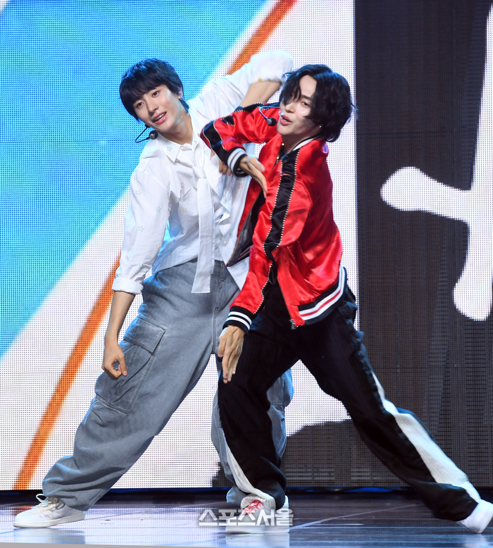 라이즈(RIIZE)의 앤톤(왼쪽)과 원빈이 4일 서울 용산구 블루스퀘어에서 진행된 첫 싱글 앨범 '겟 어 기타(Get A Guitar' 발매 기념 기자간담회에서 퍼포먼스를 선보이고 있다. 그룹 라이즈는 '성장하다(Rise)'와 '실현하다(Realize)'는 뜻의 영단어를 더해 '함께 성장하고 꿈을 실현해 나아가는 팀'의 의미를 담고 있으며 멤버 성찬, 승한, 원빈, 앤톤, 소희, 쇼타로, 은석으로 구성되어 있다. 2023. 9. 4. 박진업기자 upandup@sportsseoul.com
