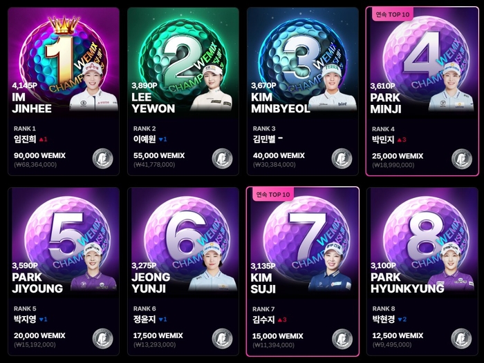 더불어 이번 대회에서 가장 많은 포인트를 획득한 선수는 ‘대세’ 박민지(25·NH투자증권)다. 공동 4위로 대회를 마무리한 박민지는 위메이드 대상 배점 320점에 연속 ‘톱10’으로 200점을 추가 획득, 총 610포인트를 적었다. 박민지의 현재 위믹스포인트 랭킹은 3계단 오른 4위다.