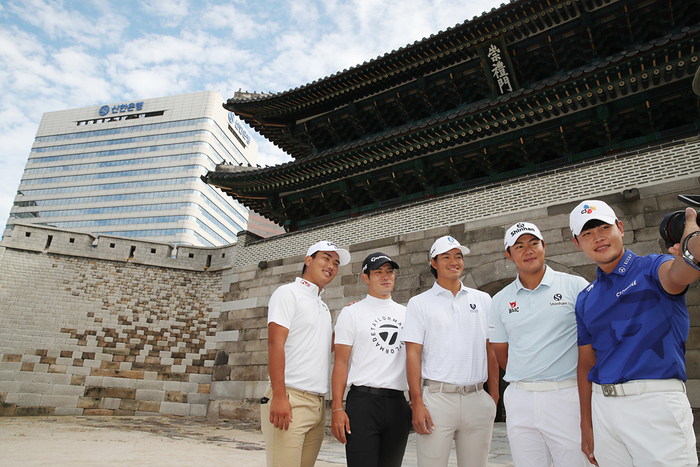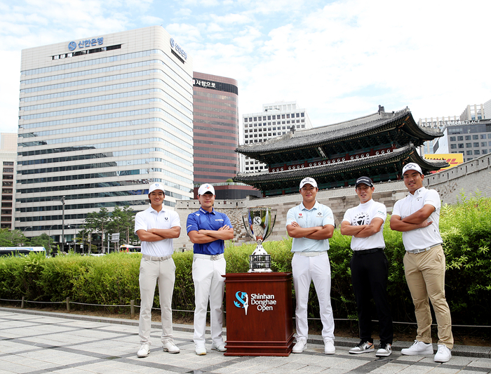 한국프로골프(KPGA) 코리안투어와 일본골프투어(JGTO) 아시안투어가 공동 주관하는 신한동해오픈이 7일 개막을 앞두고 미디어데이를 개최했다. 코리안투어 대표 주자인 이재경(24·CJ) 김성현(25·신한금융그룹) 다이치 코(홍콩) 나카지마 게이타 가와모로 리키(이상 일본·이상 23) 등 다섯 명이 5일 오전 신한은행 본점 20층 대강당에 모였다.