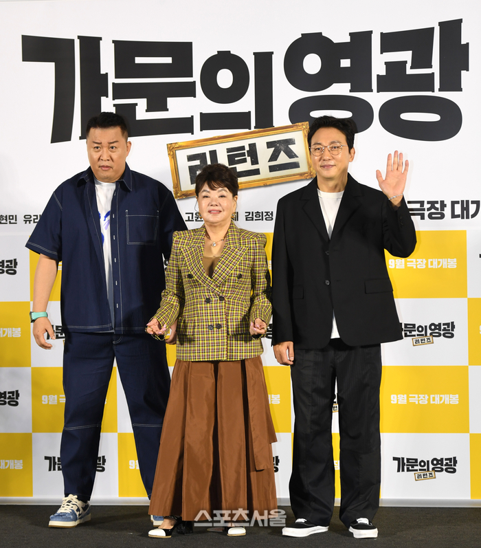 정준하, 김수미, 탁재훈(왼쪽부터)이 5일 서울 CGV 용산아이파크몰에서 열린 영화 ‘가문의 영광: 리턴즈’ 제작보고회에서 포토타임을 갖고 있다. ‘가문의 영광: 리턴즈’는 잘나가는 스타 작가 ‘대서’(윤현민 분)와 가문의 막내딸 ‘진경’(유라 분)을 결혼시키기 위해, 온갖 음모를 꾸미는 장씨 가문의 사생결단 결혼성사 대작전을 그린 코미디 영화로 21일 개봉 예정이다. 2023. 9. 5. 최승섭기자 thunder@sportsseoul.com