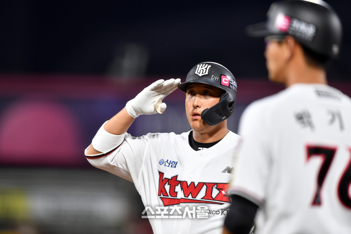 KT 2번타자 황재균이 5일 수원KT위즈파크에서 2023프로야구 KT위즈와 LG트윈스의 경기 3회말 무사 2루에서 좌전안타로 2000안타를 기록한 후 자축하고 있다. 2023.0905.