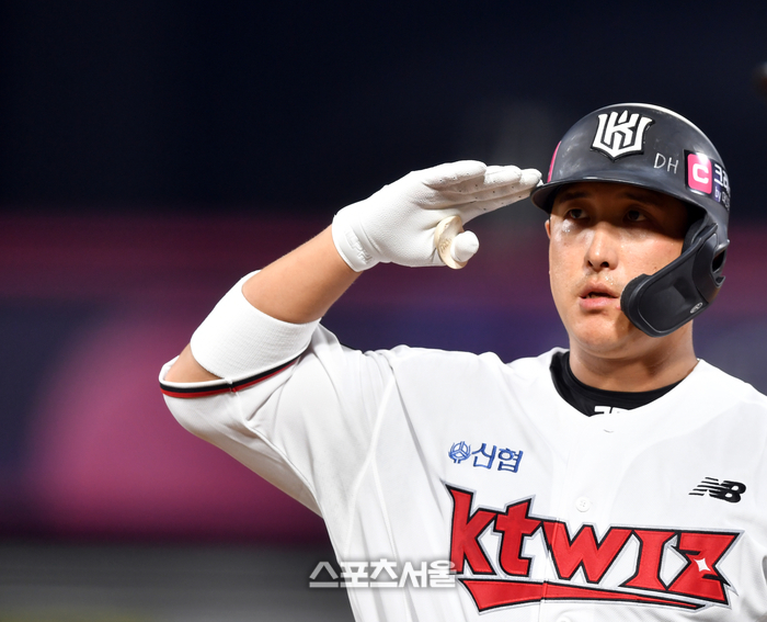 KT 2번타자 황재균이 5일 수원KT위즈파크에서 2023프로야구 KT위즈와 LG트윈스의 경기 3회말 무사 2루에서 2000안타를 기록한 후 자축하고 있다. 2023.0905.