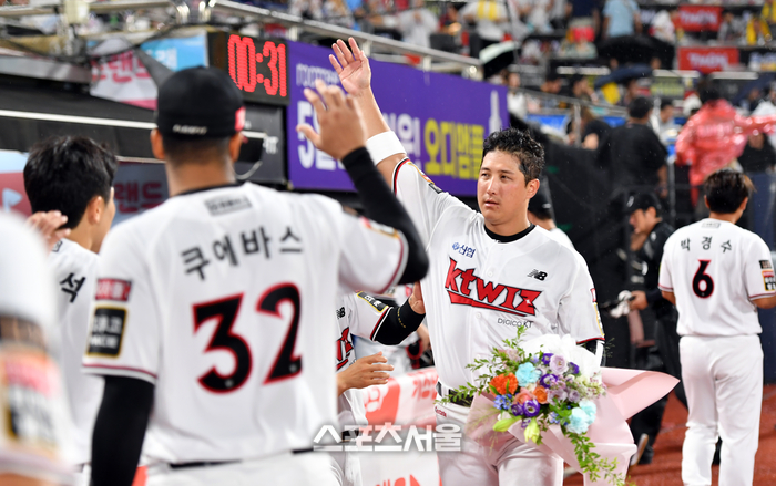 KT 2번타자 황재균이 5일 수원KT위즈파크에서 열린 2023프로야구 KT위즈와 LG트윈스의 경기 3회말 안타로 출루한 후 이닝을 끝내고 이강철 감독의 꽃다발 축하를 받고 있다. 2023.09. 05.