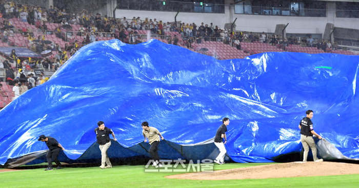 3회말이 종료되기에 앞서 강한 바람과 비가 내리기 시작했다. 마치 태풍이 온 것처럼 폭우가 내렸다. 오후 7시 44분 우천으로 경기가 중단됐고 그라운드에 방수포가 깔렸다.
