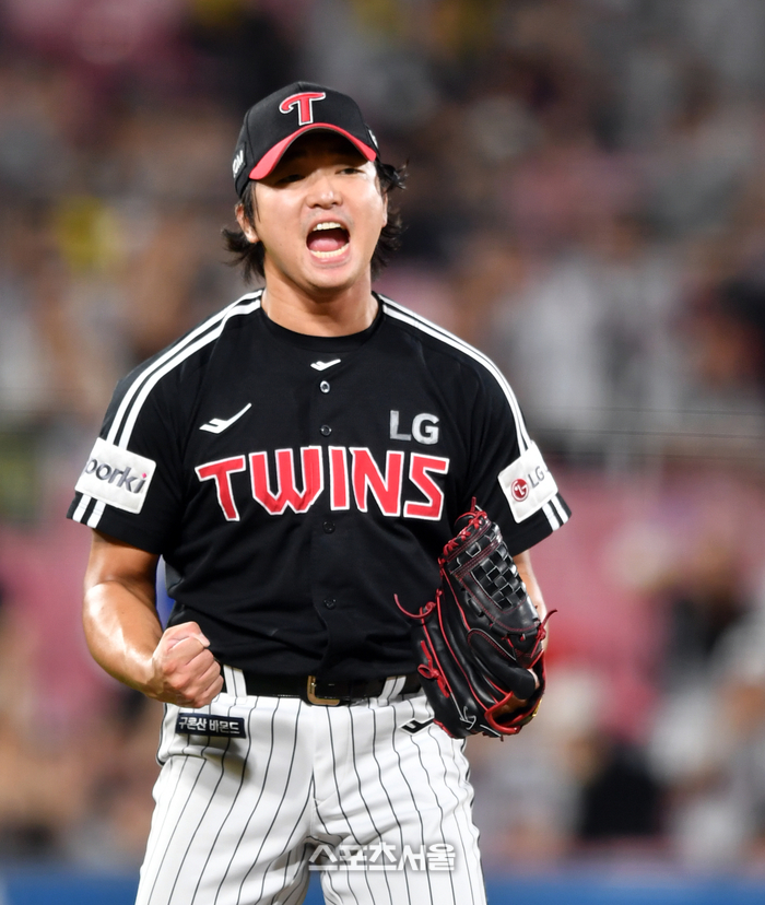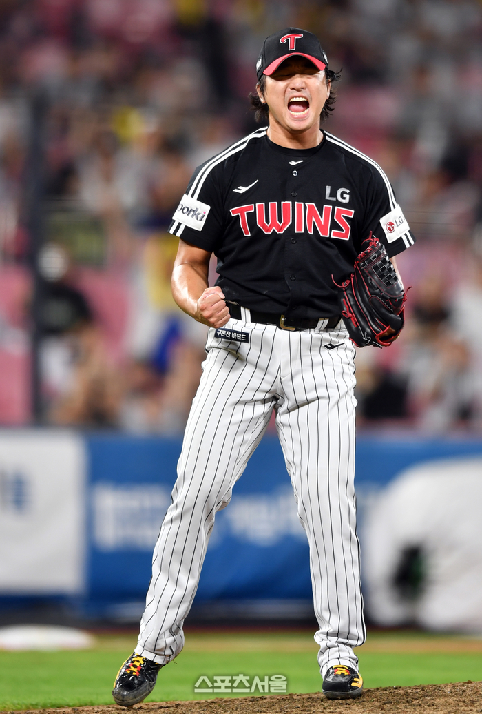 LG 마무리 고우석이 5일 수원KT위즈파크에서 열린 2023프로야구 KT위즈와 LG트윈스의 경기 9회말 마지막타자 황재균을 풀카운트 접전끝에 삼진으로 처리한 후 환호하고 있다.2023.09. 05.