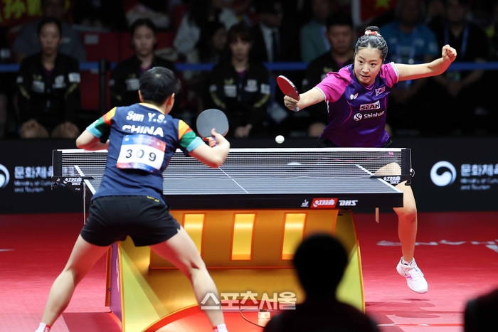 세계 9위 신유빈이 1단식에서 1위 쑨잉사한테 0-3(8-11, 7-11, 7-11), 2단식에서 33위 전지희가 2위 첸멍한테 1-3(5-11, 6-11, 11-9, 6-11)으로 패했다.