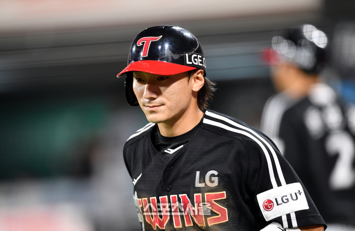 LG 2번타자 신민재가 6일 수원KT위즈파크에서 열린 2023 프로야구 KT위즈와 LG트윈스의 경기 6회초 1사 3루 오스틴의 희생타로 득점하고 있다.2023.09. 06.
