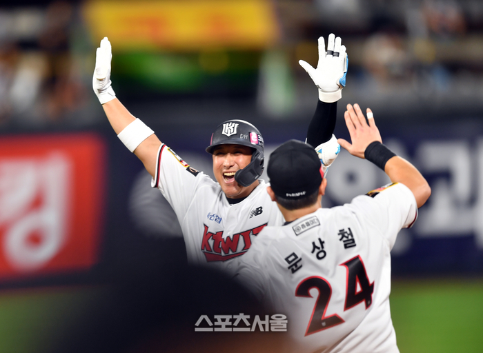 KT 2번타자 황재균이 6일 수원KT위즈파크에서 열린 2023 프로야구 KT위즈와 LG트윈스의 경기 9회말 2사 만루에서 끝내기 안타를 터트린 후 환호하고 있다.2023.09. 06.