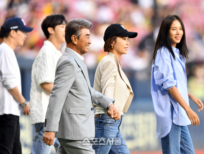 조재윤, 이덕화, 황정음, 조윤희, 엄기준, 윤종훈, 윤태영 등 7인의 탈출 배우들과 주동민 감독이 7일 잠실구장에서 열린 2023 프로야구 두산베어스와 KIA타이거즈의 경기에 앞서 그라운드에 나와 야구팬들에 인사하고 있다. 시구는 주동민 감독이 시타는 조재윤이 나섰다. 2023.0907.