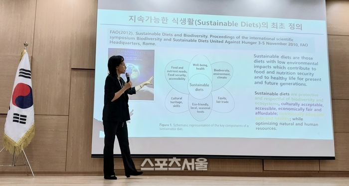 윤지현 교수에 따르면 ‘지속가능한 식생활’이란 원료의 재배에서 제품의 섭취에 이르는 식품의 순환과정에서 국민의 건강과 함께 사회와 환경의 지속가능성에 기여하는 식문화를 말하며, 이를 위해 생활양식 전반에 걸친 ‘지속가능한 식생활’과 탄소배출량 절감을 위한 ‘건강한 식단’을 제안했다.
