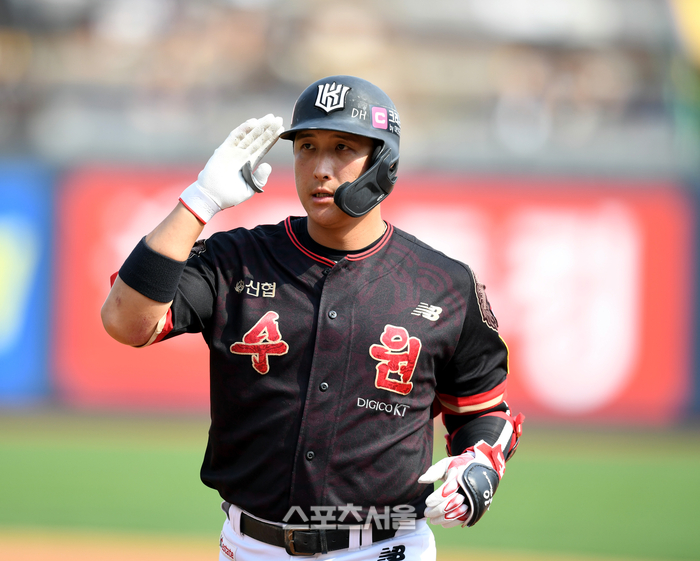KT 황재균이 10일 수원 KT위즈파크에서 열린 2023 KBO리그 SSG와 경기 4회말 1사 안타를 친 후 세리머니를 하고 있다. 2023. 9. 10. 수원 | 최승섭기자 thunder@sportsseoul.com