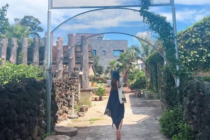 사진에는 여유로운 하루를 보내는 박한별의 모습이 담겼다. 네이비색 원피스를 입은 박한별은 모자를 푹 눌러쓴 채 신이 난 듯 양팔을 하늘로 뻗고 있다.