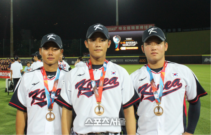 [스포츠서울 | 타이베이(대만)=길성용 객원기자] 충암고등학교 삼총사 세계청소년야구선수권에서 대한민국 대표팀의 동메달 획득에 공헌했다. 중견수 이충헌, 3루수 조현민, 투수 박건우가 그 주인공이다.