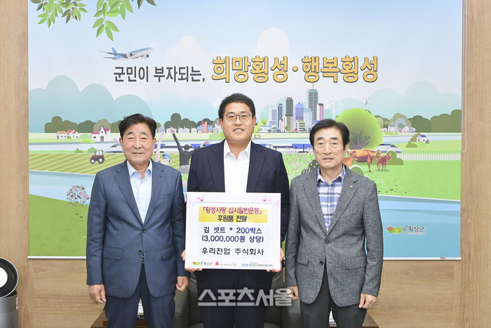 [스포츠서울ㅣ김기원 기자] 우리전업 주식회사(대표 변승만)은 9월 11일 10시 군수 집무실에서 ‘횡성사랑 십시일반운동’에 동참하는 의미에서 김 세트 200박스(300만원 상당)를 지정기탁했다.