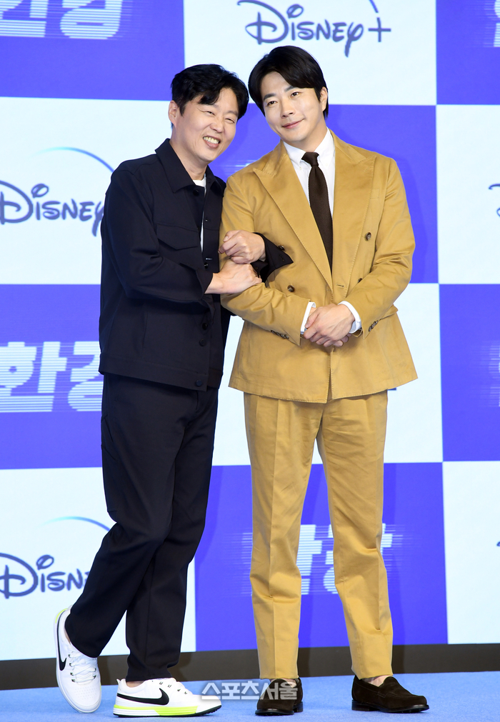 배우 김희원(왼쪽)과 권상우가 12일 서울 종로구 JW 메리어트 동대문 스퀘어에서 진행된 디즈니 플러스 드라마 '한강' 제작발표회에서 취재진을 향해 포즈를 취하고 있다. 2023. 9. 12. 박진업기자 upandup@sportsseoul.com