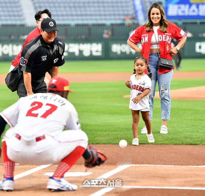 SSG 에레디아가 12일 인천SSG랜더스필드에서 열린 20223 프로야구 SSG랜더스와 KT위즈의 경기에서 시구에 나서는 딸 리아를 위해 포수자리에 앉아 있다. 왼손잡이인 리아가 오른손으로 던지는 시늉을 하고 있다.2023.09.12.
