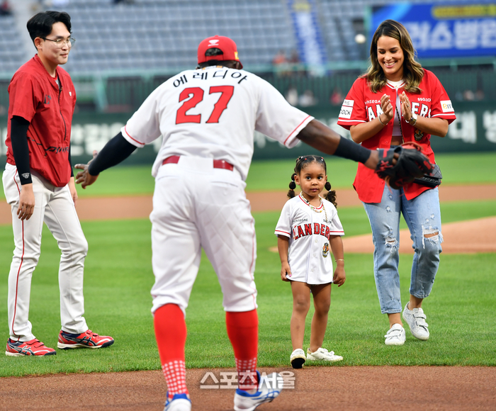 SSG 에레디아가 12일 인천SSG랜더스필드에서 열린 20223 프로야구 SSG랜더스와 KT위즈의 경기에서 시구에 나서는 딸 리아를 위해 포수자리에 앉아 있다. 왼손잡이인 리아가 오른손으로 던지는 시늉을 하고 있다.2023.09.12.