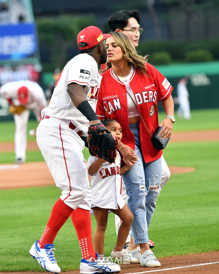 SSG 에레디아가 12일 인천SSG랜더스필드에서 열린 20223 프로야구 SSG랜더스와 KT위즈의 경기에서 시구에 나서는 딸 리아를 위해 포수자리에 앉아 있다. 왼손잡이인 리아가 오른손으로 던지는 시늉을 하고 있다.2023.09.12.