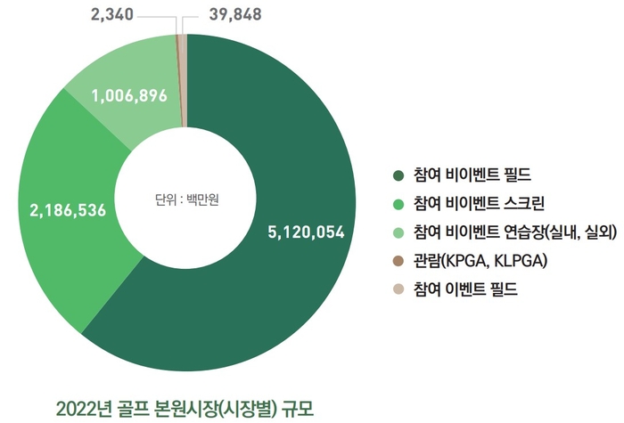 골프산업의 핵심으로 평가받는 골프에 직접 참여하거나 이벤트 대회 관람 등에 비용을 지급하는‘본원시장’은 8조3556억원으로 집계됐다. 전체 골프시장의 40.4%에 달했다. 필드골프에 직접 참여하는 시장(참여 비이벤트 필드) 거래액은 본원시장 전체 규모의 61.3%인 5조1200억원으로 가장 높았다. 지난해 국내 골프장 수익이 5조1200억원 수준이라는 것을 유추할 수 있는 결과다.