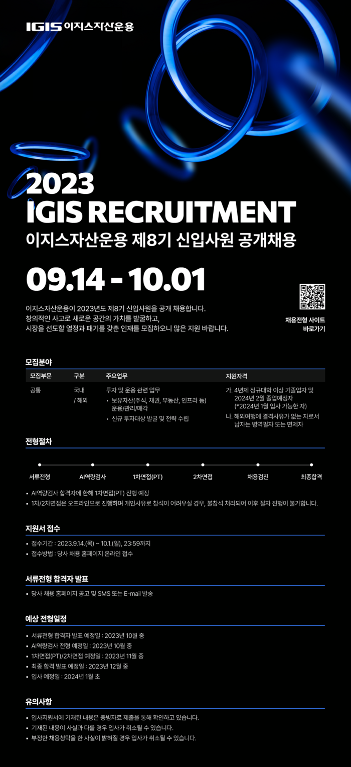 [스포츠서울 | 홍성효기자] 이지스자산운용이 제8기 신입사원 공개채용을 진행한다고 14일 밝혔다.