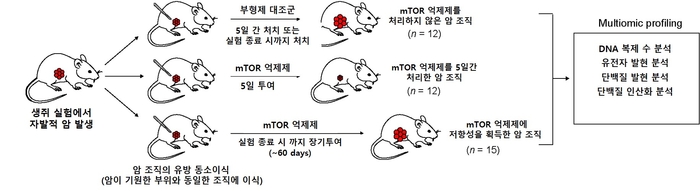 연구팀은 생쥐실험을 통해 면역세포와 기저세포 등 다양한 세포가 암세포 주위에 존재하는 실제 인체 내 환경과 유사한 환경에서 mTOR 억제제에 관한 저항성 연구를 수행했다. 유전자 변이를 통해 생쥐에서 자발적으로 유방암이 발생하도록 유도했다. 암이 생긴 쥐에 mTOR 억제제를 장기간 투여해 저항성이 발생하는 과정에서 시료를 채취해, 다중오믹스(Multi-Omics) 연구기법으로 전체 유전자 및 단백질의 변화를 추적했다.