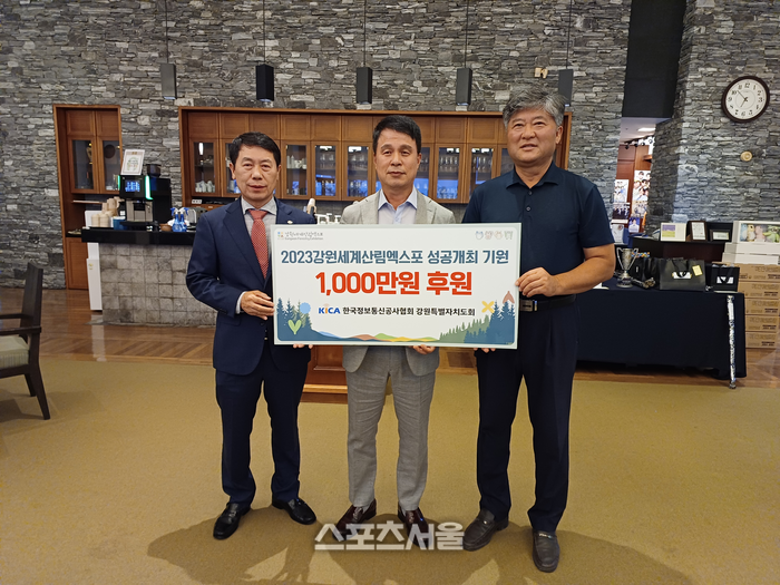 [스포츠서울ㅣ춘천=김기원 기자] (재)강원세계산림엑스포조직위원회(조직위원장 김진태)는 지난 9월 14일(목) ‘2023 강원세계산림엑스포’ 성공 개최를 기원하며 한국정보통신공사협회 강원특별자치도회(회장 안종관)에서 입장권(1천만원)을 구매하였다고 밝혔다.