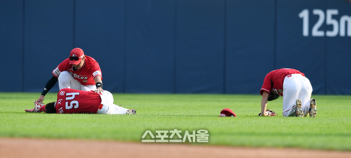 SSG 랜더스 중견수 최지훈(왼쪽 아래)와 2루수 김성현이 17일 잠실구장에서 열린 2023 KBO리그 LG 트윈스와 더블헤더 1차전 6회말 2사 1루 LG 박동원의 타구를 잡으려다 충돌하면서 그라운드에 쓰러지자 좌익수 한유섬이 동료들의 상태를 살피고 있다. 2023. 9. 17. 잠실 | 박진업기자 upandup@sportsseoul.com