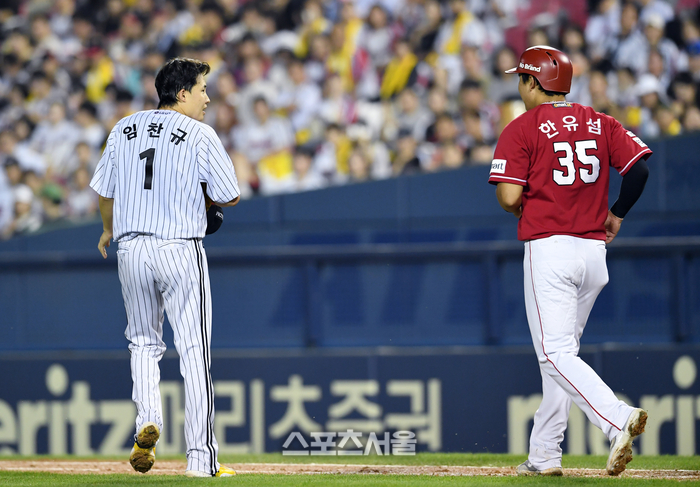 LG 트윈스 선발투수 임찬규(왼쪽)가 17일 잠실구장에서 열린 2023 KBO리그 SSG 랜더스와 더블헤더 2차전 3회초 1사 2루 상황에서 자신의 투구에 몸을 맞은 SSG 한유섬에게 사과를 하고 있다. 2023. 9. 17. 잠실 | 박진업기자 upandup@sportsseoul.com