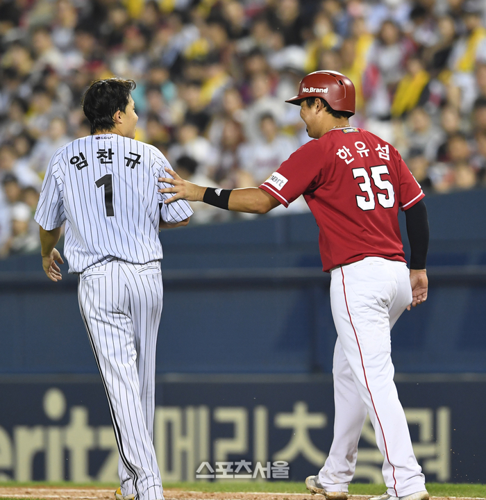 LG 트윈스 선발투수 임찬규(왼쪽)가 17일 잠실구장에서 열린 2023 KBO리그 SSG 랜더스와 더블헤더 2차전 3회초 1사 2루 상황에서 자신의 투구에 몸을 맞은 SSG 한유섬에게 사과를 하고 있다. 2023. 9. 17. 잠실 | 박진업기자 upandup@sportsseoul.com