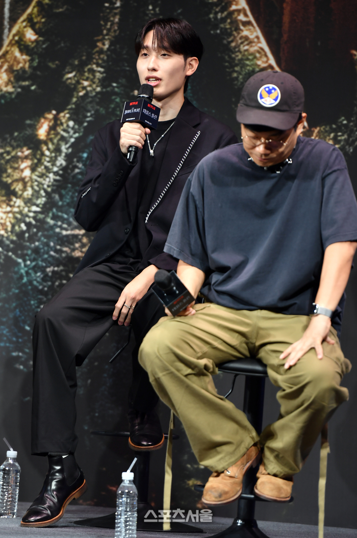 김동재가 넷플릭스 두뇌서바이벌 예능 ‘데블스 플랜’ 제작발표회 무대에 올라 포토타임을 갖고 있다.