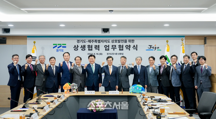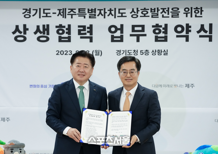 [스포츠서울ㅣ김기원 기자] 제주특별자치도와 경기도는 18일 오후 경기도청 상황실에서 상호 신뢰와 협력으로 지속가능한 상생발전을 이루기 위해 ‘제주·경기 상생협력 업무협약’을 체결했다고 밝혔다.