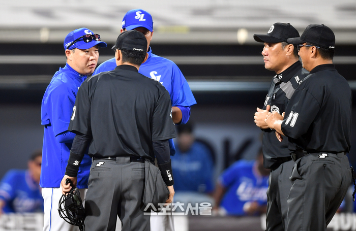 삼성 박진만 감독이 19일 수원KT위즈파크에서 열린 2023프로야구 KT위즈와 삼성라이온즈의 경기 8회말 1사 1루 김상수 타석때 구심에 어필하고 있다. 오현규 구심이 1루주자 배정대에 많은 견제구를 던진 삼성 투수 김태훈에 이야기를 하러 나서자 상황을 파악하기위해 박진만 감독이 나서고 있다.