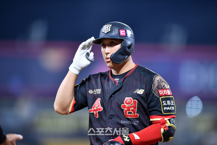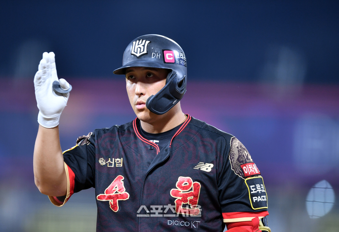 KT 2번타자 황재균이 19일 수원KT위즈파크에서 열린 2023프로야구 KT위즈와 삼성라이온즈의 경기 8회말 2사 만루에서 2타점 안타를 터트린 후 자축하고 있다.2023.09.19.