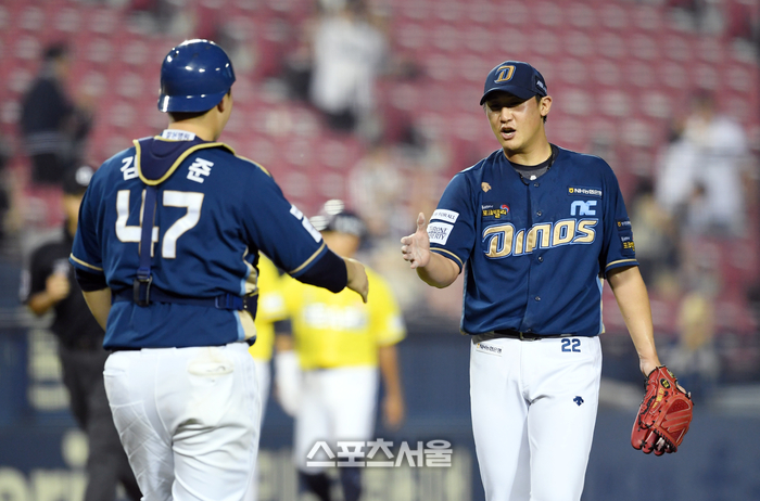 NC 다이노스 이용찬이 19일 잠실구장에서 열린 2023 KBO리그 두산 베어스와 경기에서 승리를 지켜낸 뒤 포수 김형준과 악수를 나누고 있다. 이용찬은 1이닝을 1실점으로 막아내며 시즌 25세이브를 기록했다. 2023. 9. 19. 잠실 | 박진업기자 upandup@sportsseoul.com