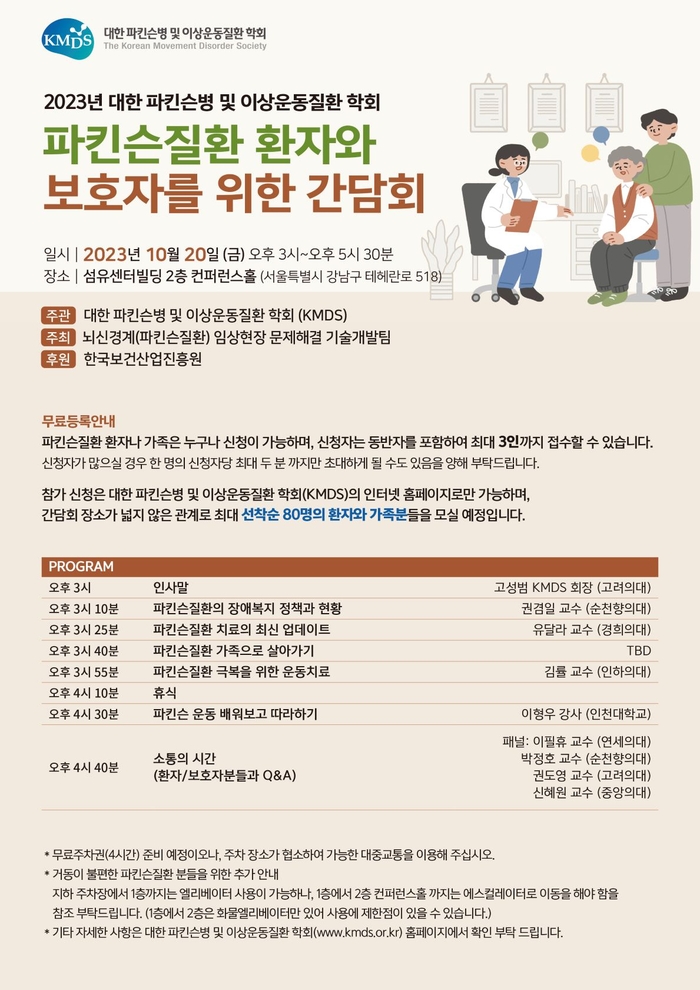 대한 파킨슨병 및 이상운동질환 학회(KMDS)가 다음달 20일 오후 3시, 서울 강남구 섬유센터빌딩 2층 컨퍼런스홀에서 ‘파킨슨질환 환자와 보호자를 위한 간담회’를 연다고 20일 밝혔다.