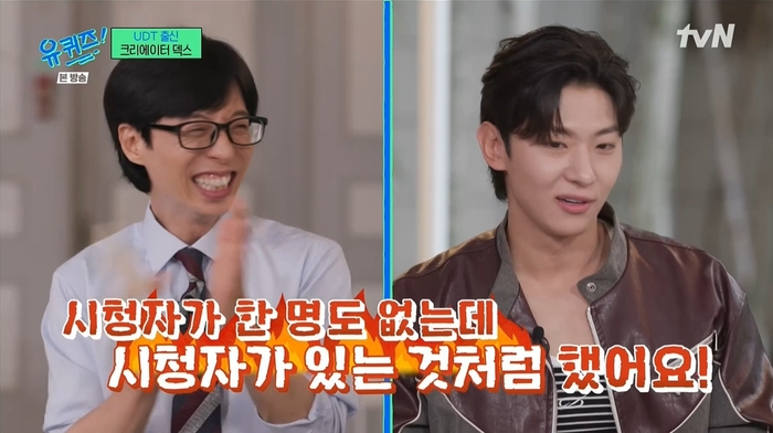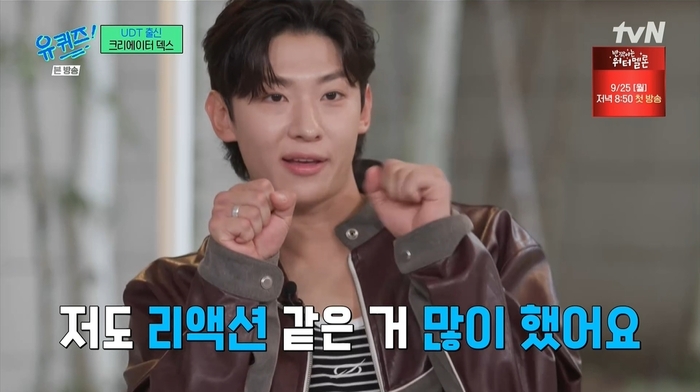 덱스는 UDT에 입대하게 된 계기도 밝혔다. 전남 순천 출신인 그는 마른 체형에 공부에 흥미가 없던 아이였다. 하지만 수영은 좋아했다고. 고등학교 졸업 후 수영 강사를 했다며 “서울 강남의 수영 강사로 추천해서 ‘나도 서울살이를 하나 보다’ 했다. 알고 보니 월급도 밀리고 강사님들도 다 그만두기 직전인 상황이었다. 다른 강사님이 다른 수영장을 추천해주셨는데 월세방 구할 돈도 없었다. 센터 밑에 있는 보일러실을 쓰게 해주셔서 매트 하나 놓고 생활하게 됐다”라고 운을 뗐다.