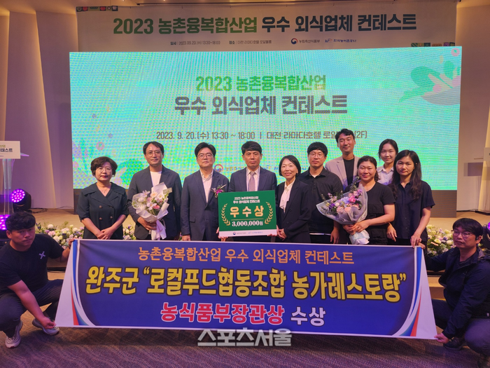[스포츠서울ㅣ김기원 기자] 농림축산식품부에서 개최(‘23.9.20)한「2023년도 농촌융복합산업 우수 외식업체 콘테스트」에서 완주군 완주로컬푸드협동조합(권승환 이사장) 농가레스토랑 ’행복정거장‘이 우수상을 수상했다