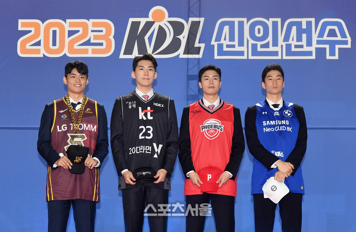 21일 잠실학생체육관에서 열린 2023 KBL 신인선수 드래프트에서 지명 선수들이 기념촬영을 하고 있다. 왼쪽부터 3순위 연세대 유기상(LG 세이커스), 1순위 고려대 문정현(KT 소닉붐), 2순위 고려대 박무빈(현대모비스 피버스), 4순위 일반인 참가자 세리토스대 조준희(삼성 썬더스). 2023. 9. 21. 잠실학생 | 박진업기자 upandup@sportsseoul.com