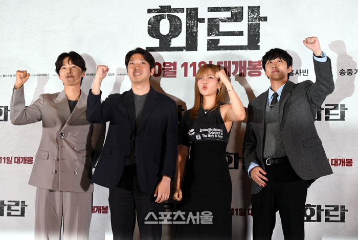 송중기, 김창훈 감독, 김형서(비비), 홍사빈(왼쪽부터)이 22일 서울 강남구 메가박스 코엑스에서 열린 영화 ‘화란’ 언론시사회에서 포토타임을 갖고 있다. 2023. 9. 22. 최승섭기자 thunder@sportsseoul.com