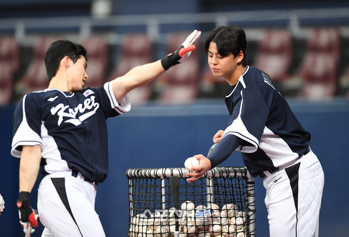 항저우 아시안게임 대한민국 야구 대표팀의 노시환(오른쪽)이 24일 고척스카이돔에서 진행된 훈련 중 김혜성의 티배팅을 돕고 있다. 2023. 9. 24. 고척 | 박진업기자 upandup@sportsseoul.coma