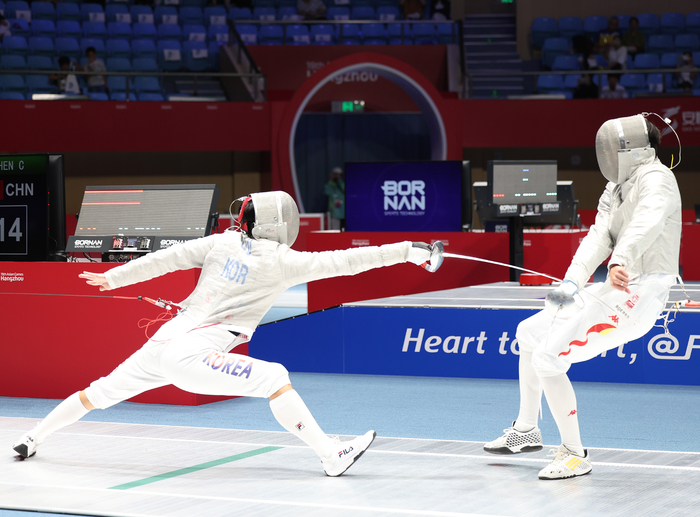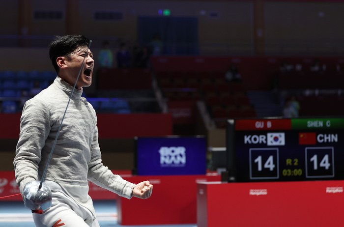 구본길은 25일 전자대학 체육관에서 열린 2022 항저우 아시안게임 남자 사브르 4강전에서 유시프 알샤믈란(쿠웨이트)를 15-10으로 제압하고 결승에 올랐다.
