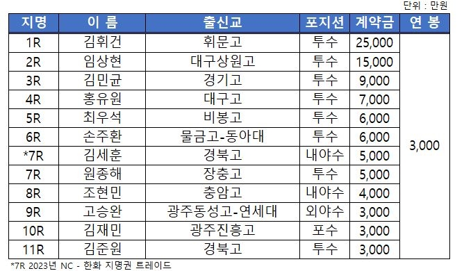 1라운드에서 부름을 받은 김휘건(휘문고)에게 계약금 2억5000만원을 안겨줬다. 임상현(대구상원고), 김민균(경기고) 등 2, 3라운드 지명자에게도 계약금 1억5000만원과 9000만원을 지급한다.