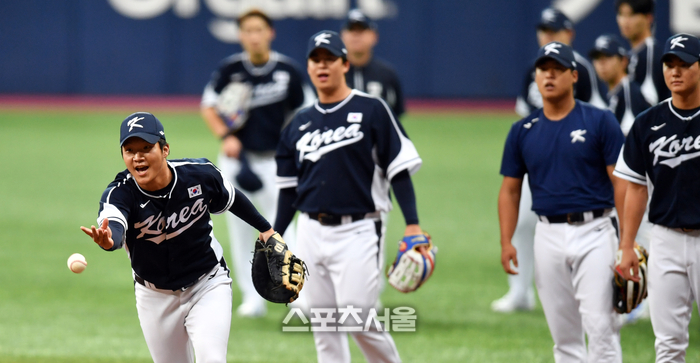 야구대표팀 내야수 문보경이 27일 고척스카이돔에서 열린 국내 마지막 훈련에서 수비포메이션 훈련을 하고 있다.