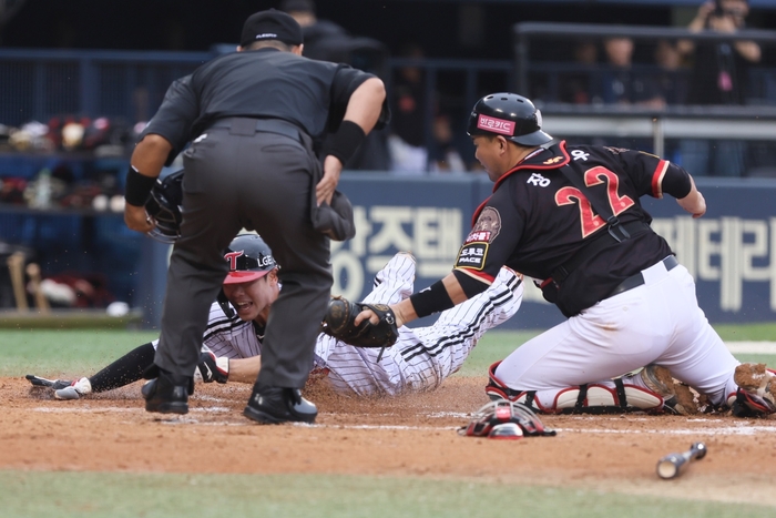 LG는 5회말에 1점을 더했다. 홍창기가 볼넷으로 출루했고 신민재 타석에서 폭투가 나와 무사 2루가 됐다. 신민재의 희생 번트로 1사 3루. 김현수 타석에서 콘택트 플레이가 나왔고 홍창기는 빠르게 홈으로 질주해 김현수의 2루 땅볼에 슬라이딩으로 홈을 터치해 득점했다. KT가 비디오 판독을 요청했으나 판정 번복은 없었다.