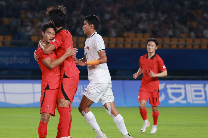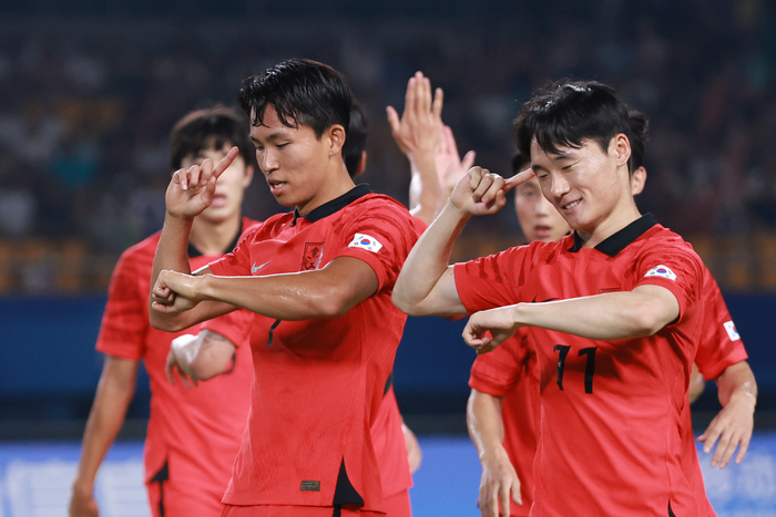 황선홍 감독이 이끄는 아시안게임 남자 축구대표팀은 27일 중국 저장성 진화 스포츠센터에서 열린 2022 항저우 아시안게임 남자 축구 16강전에서 키르기스스탄에 2-1로 앞서고 있다.
