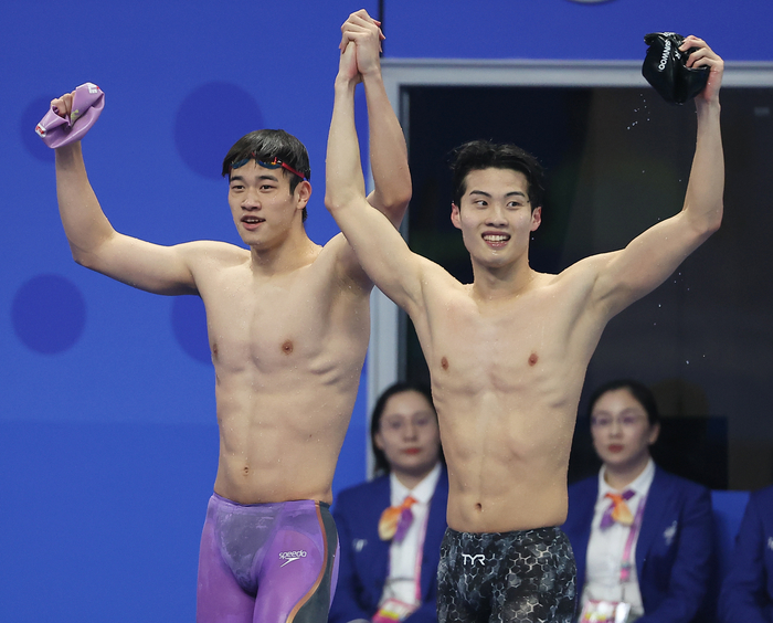 한국 남자수영의 ‘간판’ 황선우(20·강원도청)가 날았다. 그리고 중국 수영의 스타 판잔러(19)는 아쉬움을 삼켰다. 그러나 경기와 우정은 또 별개다. 황선우의 손을 번쩍 들어줬다. ‘찐친 바이브’ 제대로다. 황선우도 웃었다. 그렇게 아시아의 수영 강자들이 나란히 성장하고 있다.