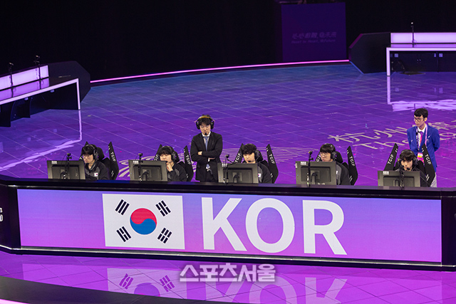 이날 한국은 지난 준결승 중국전에 이어 미드라이너 ‘쵸비’ 정지훈을 앞세워 ‘제우스’ 최우제, ‘카나비’ 서진혁, ‘룰러’ 박재혁, ‘케리아’ 류민석으로 라인업을 꾸렸다. 이날 경기장에 만난 우리네 전설 ‘페이커’ 이상혁은 여전히 마스크를 쓰고 있는 것으로 미뤄봤을 때 컨디션이 완전히 회복되지 않은 것으로 보였다.