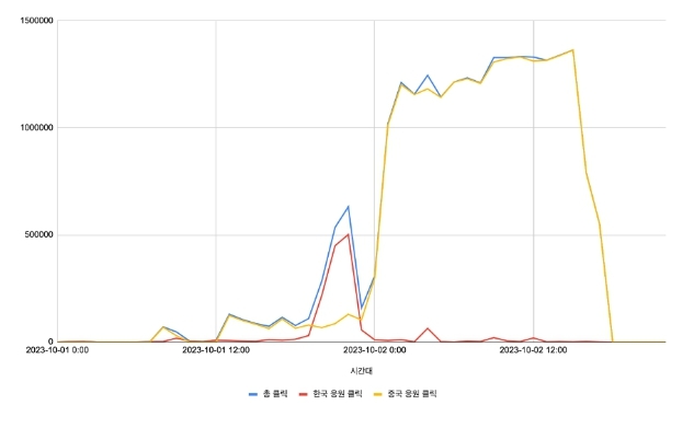 이날 클릭 응원에 참여한 것으로 확인된 IP 5591개 중 국내 IP 비중은 95%(5318개)로 일반적인 수준이었다. 확인된 IP가 만들어낸 총 클릭 응원 수 2294만 건 가운데 해외 IP 비중이 86.9%(1993만 건)로 파악됐다.